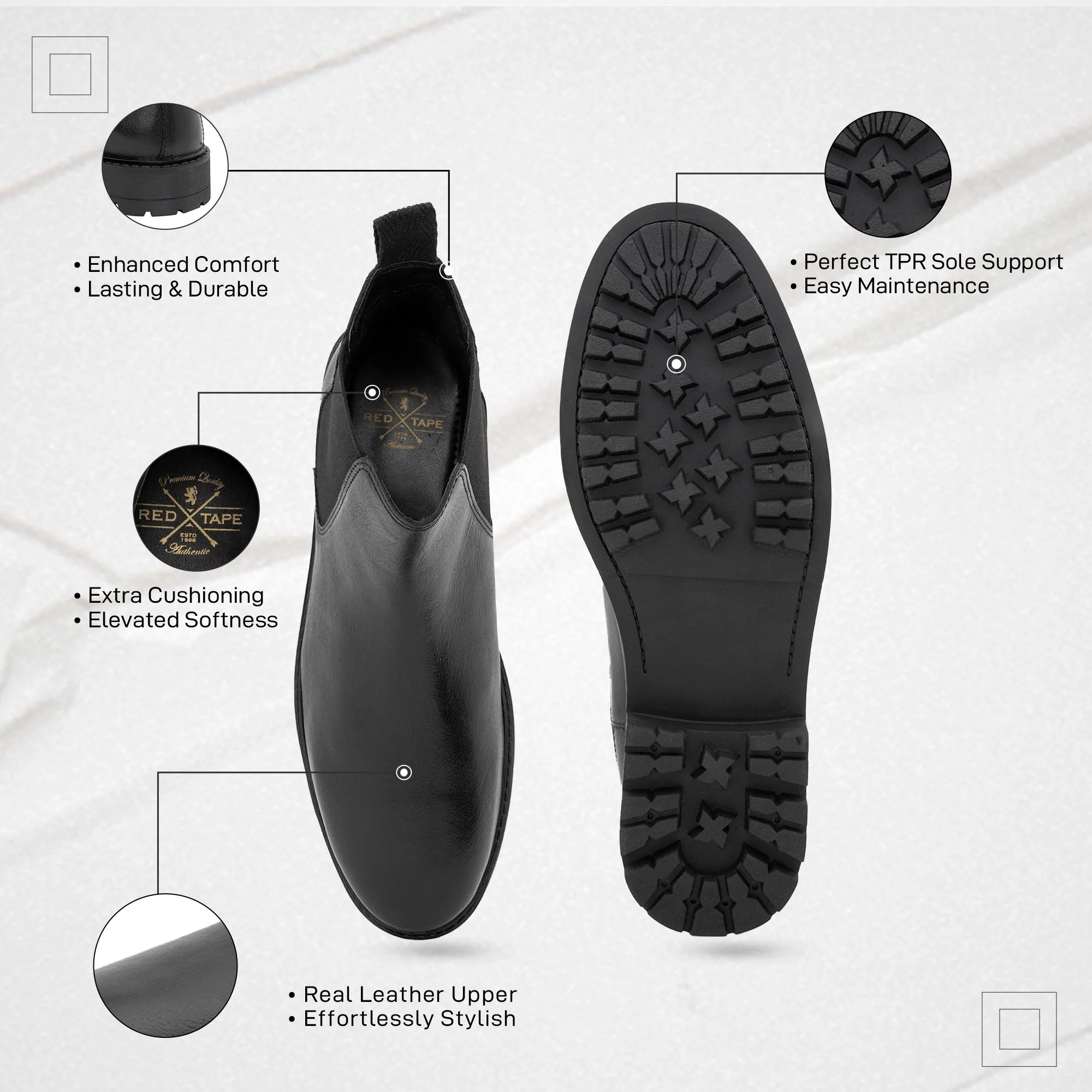 Refined yet rugged, Red Tape’s Chelsea boots for men offer timeless appeal with modern comfort. The leather upper, slip-on design, and High Density Foam insole provide ease, durability, and a polished look suitable for various occasions.